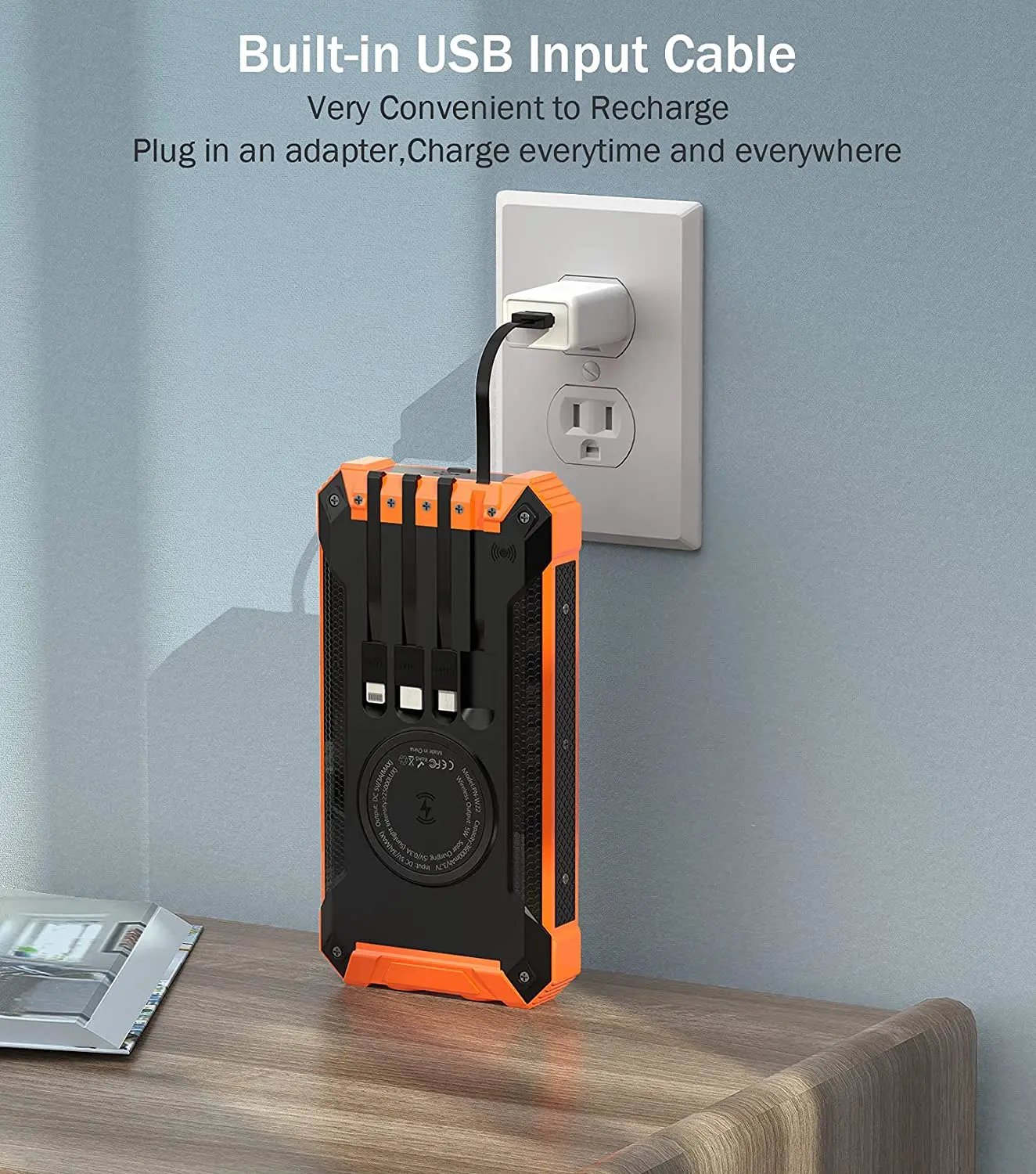 - [ Built-in 4 Charging Cables]This cable-free solar phone charger is built with 1 USB input cable and 3 output cables (1 type-C cable & 1 micro cable & 1 IOS cable ). No matter input or output, you don’t need to carry charging cables. An additional charging cable is provided for your convenience!