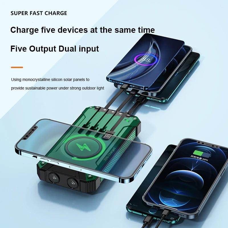 - [7 ports & Wireless Charging]This solar charger power bank supports 5W wireless charging, compatible with all Qi-enabled mobile devices. Equipped with 7 ports ( Micro USB & Type C input ports and USB & Type C Output ports), it supports charging 6 devices simultaneously.